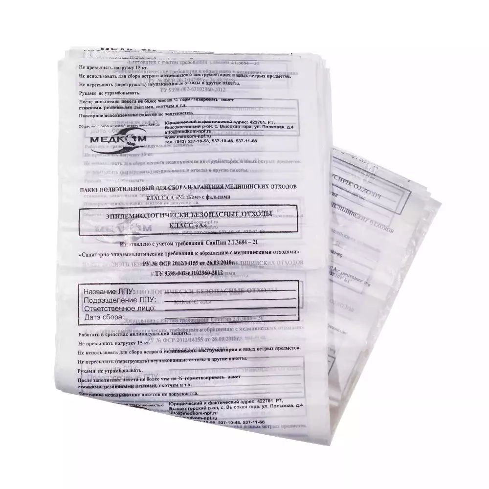 Пакет для сбора медицинских отходов, класс Б (желтый), размер 500х600мм, объем 30,0л, плотность 11 микрон