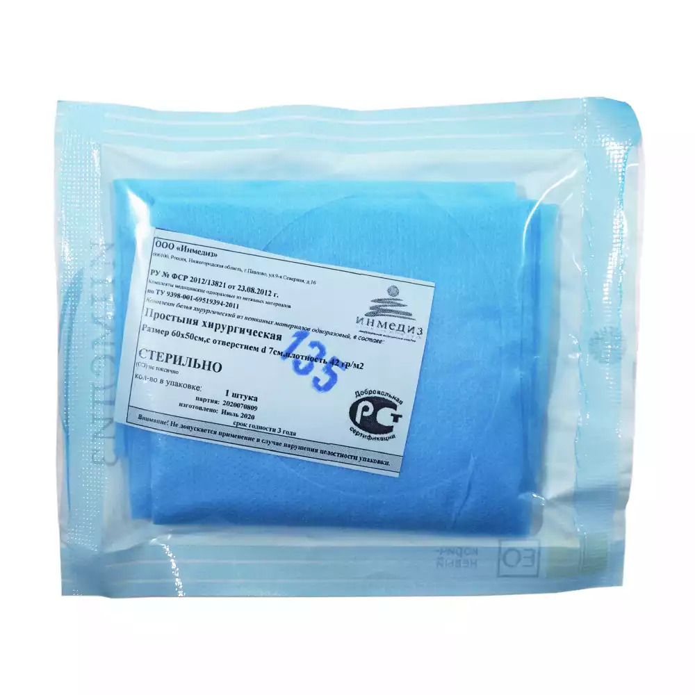 Простыня 70*80см, материал СМС 42м2, стерильная, белая, с РУ, Инмедиз (РОССИЯ)