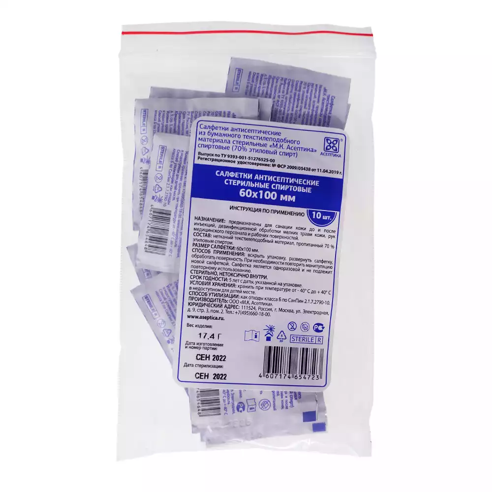 Салфетка спиртовая антисептическая для инъекций, размер 60*100мм, 70% этиловый спирт, упаковка 10шт, Z-пакет, Асептика М.К.