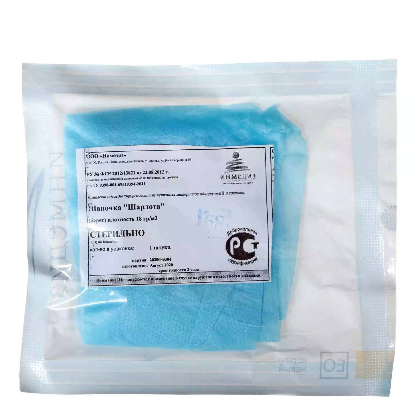 Шапочка -берет Шарлотта, плоская, плотность 10г/м2, нестерильная, цвет голубой, СпецМедЗащита КФ (РОССИЯ), 100 шт