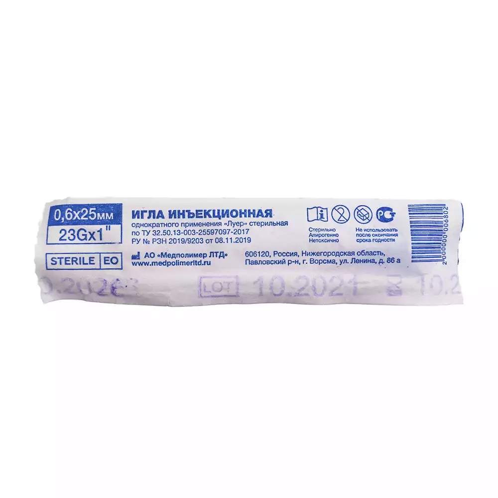 Игла инъекционная 23G (0,6х25мм), тонкая стенка, стерильная, синяя