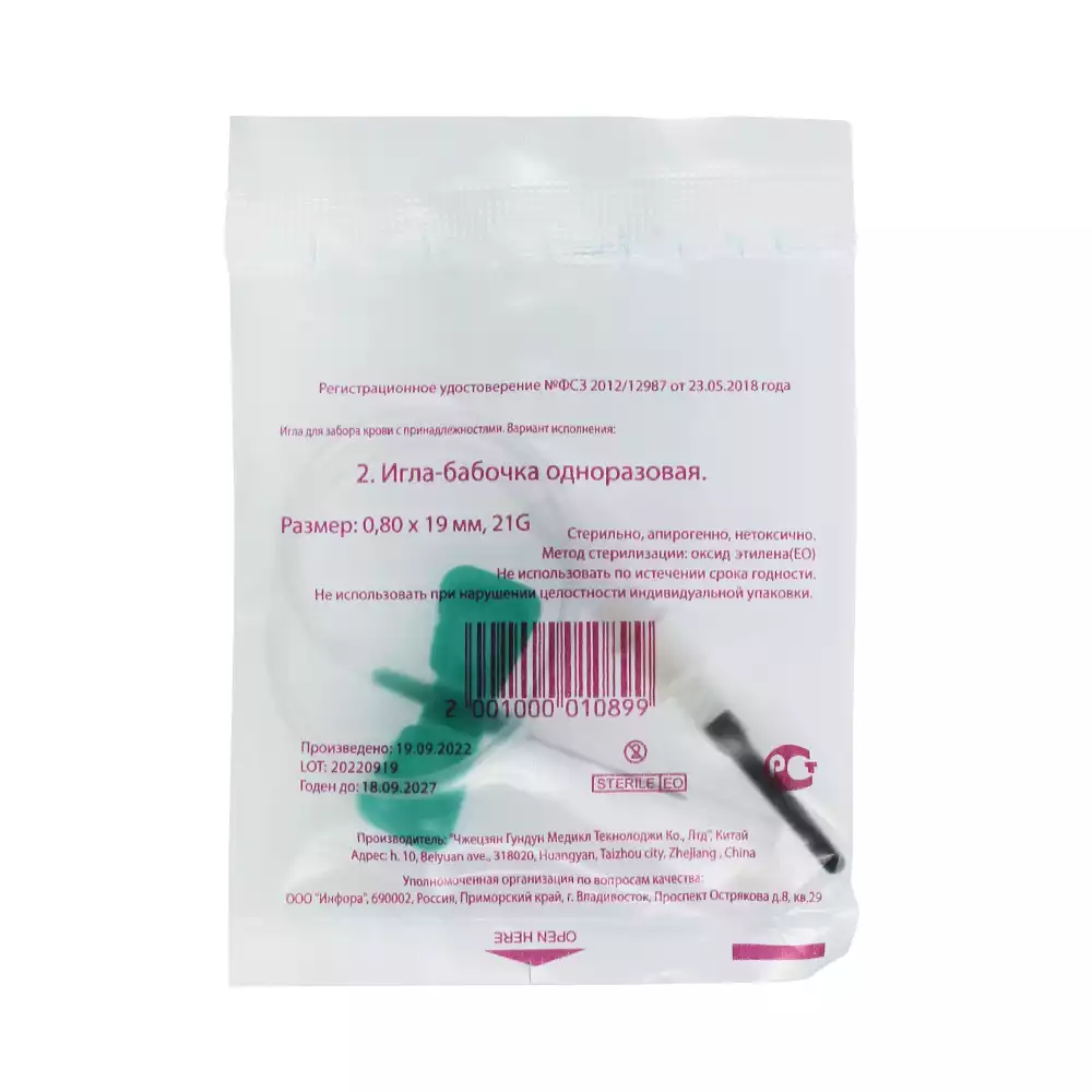 Размер: 21Gх3/4, длина трубки 19см, диаметр 0,80мм, материал иглы: нержавеющая сталь, цвет - зеленый, одноразовая стерильная.
