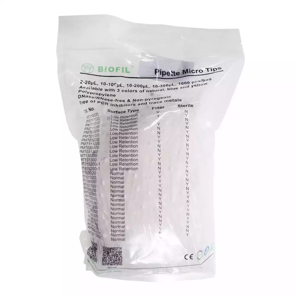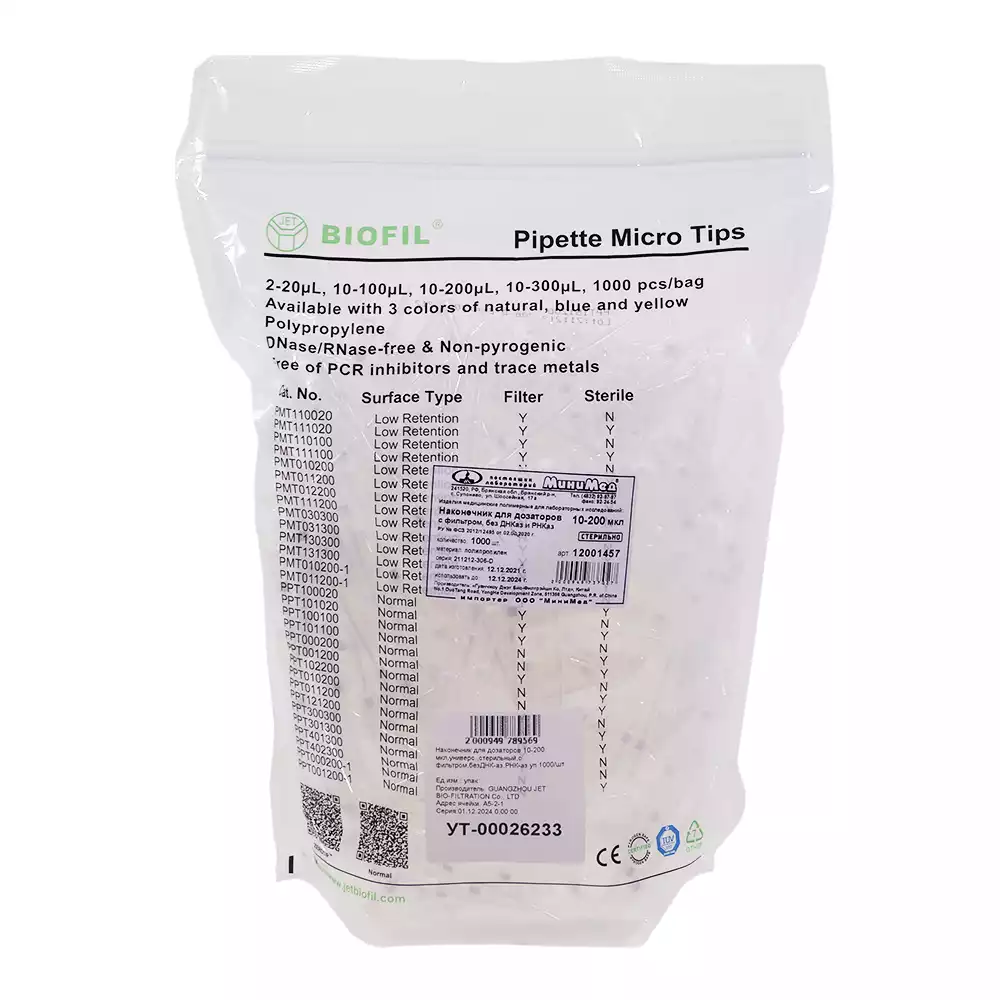 Наконечник для дозаторов 10-200 мкл, универсальный с фильтром, без ДНК-аз, РНК-аз, стерильный, упаковка 1000шт в пакете