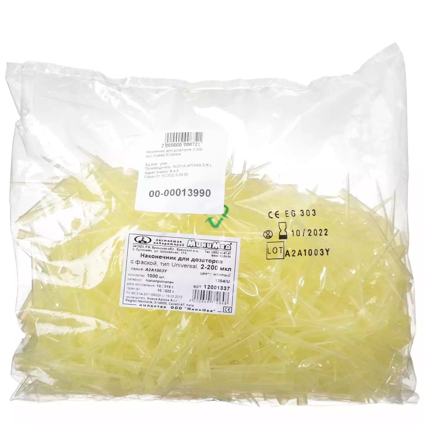Наконечник для дозаторов универсальный, объем 2-200 мкл, цвет - желтый, с фаской, упаковка 1000шт