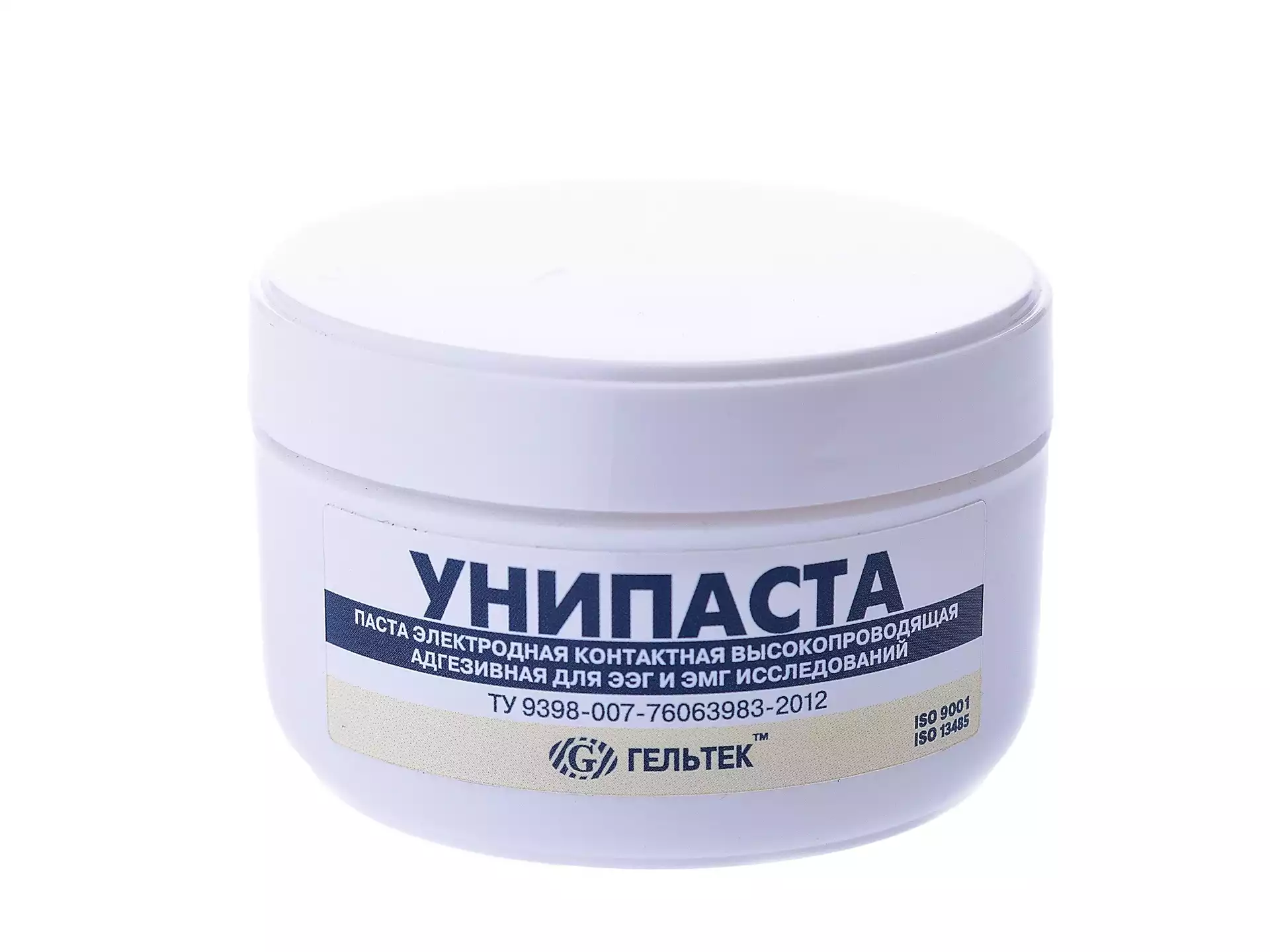 Паста электродная контактная, высокопроводящая, адгезивная «Унипаста» - применяется в качестве фиксирующей и электропроводящей контактной среды при установке электродов на поверхности головы и тела при проведении следующих электрофизиологических исследований: электроэнцефалографии (ЭЭГ),вызванных потенциалов (ВП) мозга, транскраниальной магнитной стимуляции (ТМС), электромиографии (ЭМГ) и определении скоростей проведения по нервам, полисомнографии, проведении биообратной связи (БОС) по ЭЭГ и ЭМГ и т.д. Паста Унипаста обеспечивает надежный контакт при работе с многоразовыми электродами при проведении различных электронейромиографических исследований, позволяет электродам оставаться на месте, проводя электрические сигналы, паста не высыхает, крепко держится на коже пациента и позволяет проводить длительную и качественную реагистрацию ЭЭГ сигнала как у детей, так и взрослых.