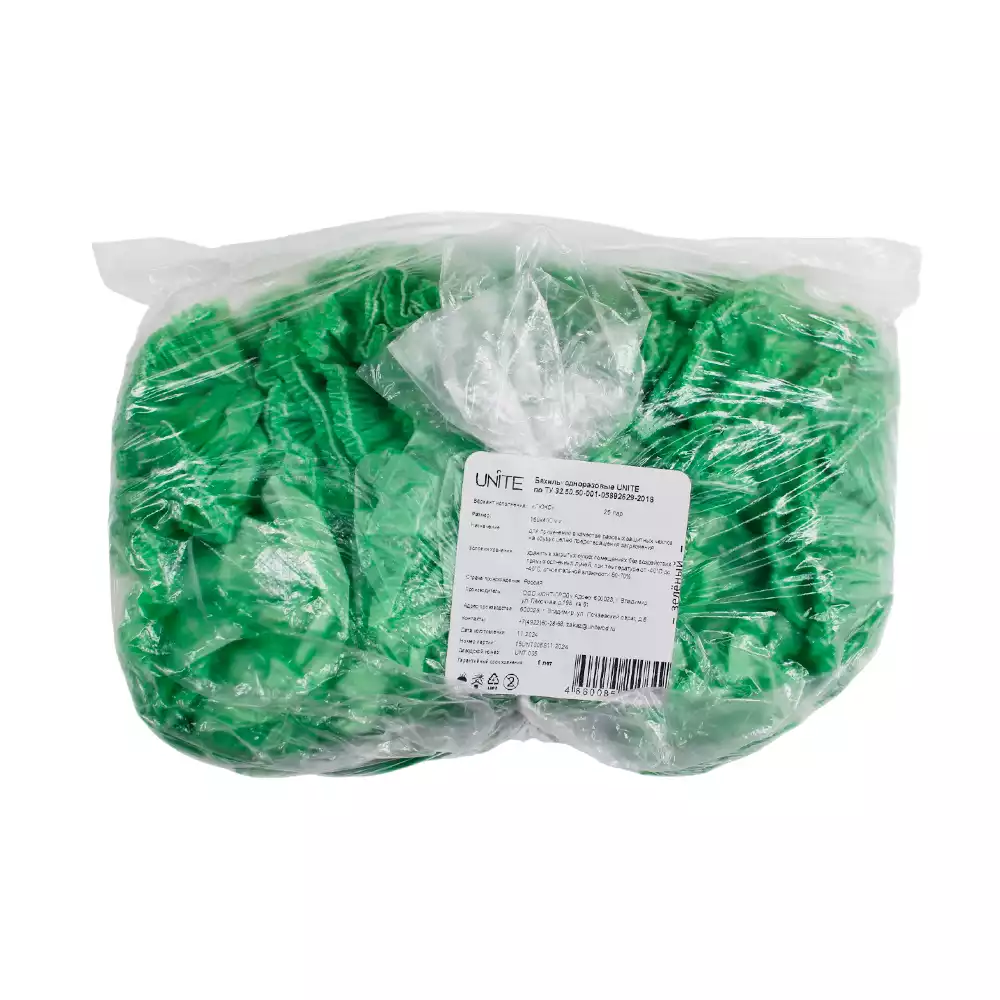 Бахилы UNITE "Люкс" ПНД 40мкм, полиэтиленовые, гладкие, вес 4,0 гр/пара, размер 400*150мм, цвет - зеленый