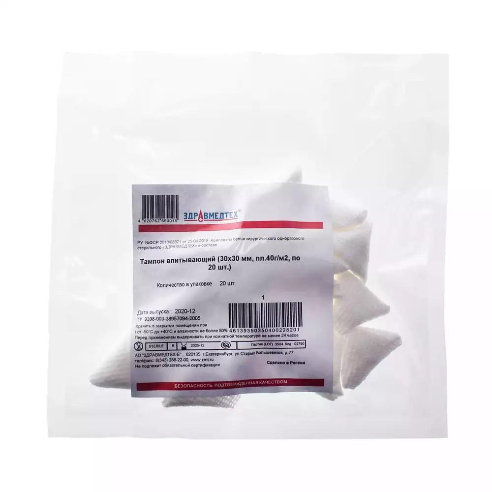 Тампон впитывающий треугольный, размер в свернутом виде 3*3*3мм, материал нетканная марля пл.40г/м2 (сетка), стерильный