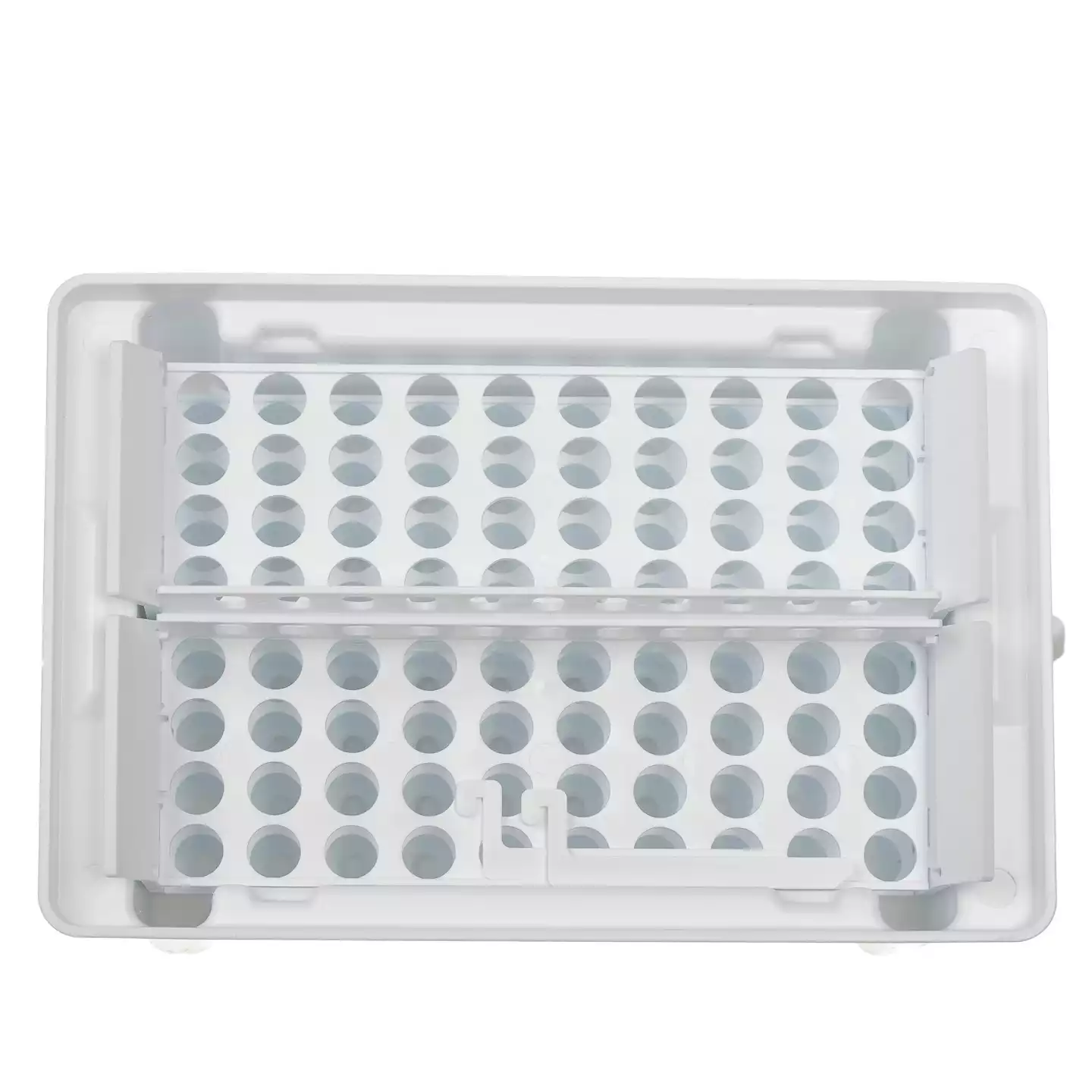 Вариант 2 - Максимальное количество переносимых пробирок — 80 шт. Корпус, крышка с защелками, две подставки для пробирок на 80 штук.