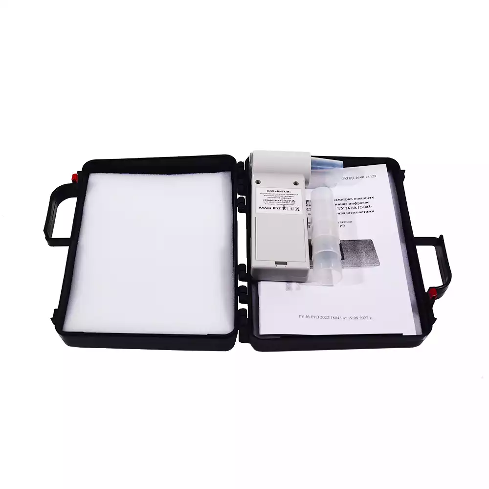 Комплект поставки включает футляр-укладку, сам спиротест, батарейки, пять стерилизуемых мундштуков, паспорт.