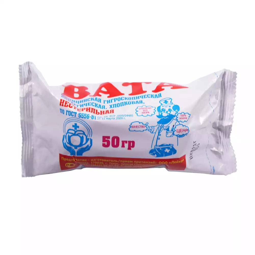 Вата медицинская хирургическая 50 гр. нестерильная, используется в медицинских и гигиенических целях, производится из натурального длинноволокнистого сырья (волокна 100% хлопка высшей пробы) без добавления добавок и примесей.